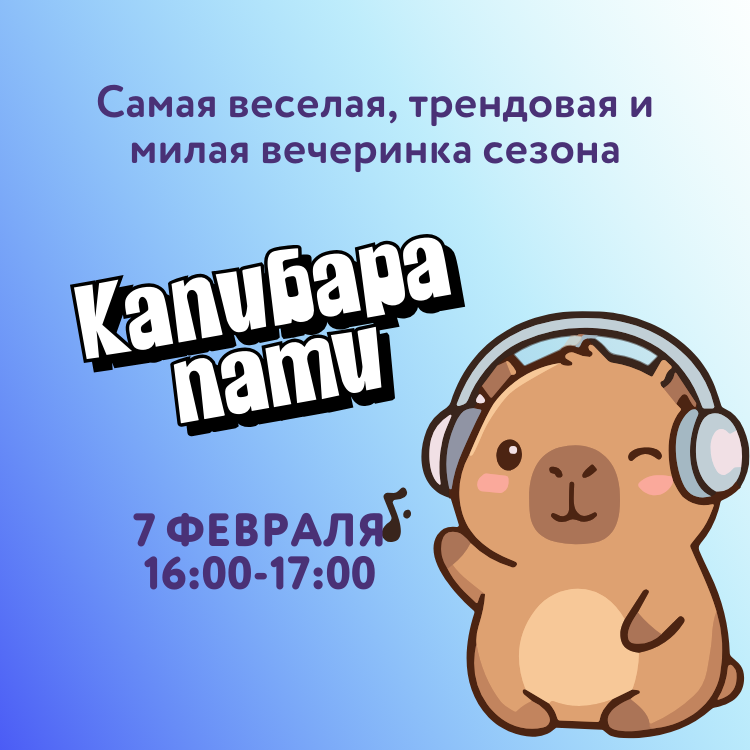 Приготовьтесь к веселью на самой забавной вечеринке года — Капибара Пати! Вас ждут зажигательные танцы, увлекательные конкурсы и масса сюрпризов! Под веселую музыку каждый найдет себе занятие по душе: от танцев до шуточных состязаний! Проведите время с друзьями, зарядитесь положительными эмоциями и наслаждайтесь атмосферой настоящего праздника в компании капибар!
