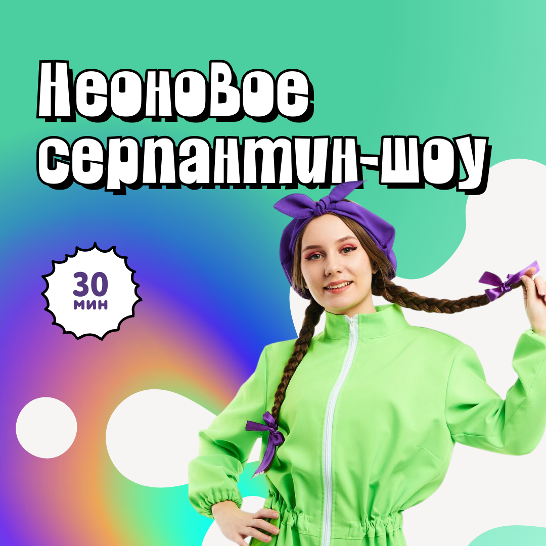 Это самое яркое и модное шоу, ведь на нем можно шалить и отрываться на всю катушку - бросаться светящимися лентами, создавать яркие сугробы, и купаться в свете ультрафиолета! Неоновое серпантин-шоу — яркая атмосфера вашего праздника.