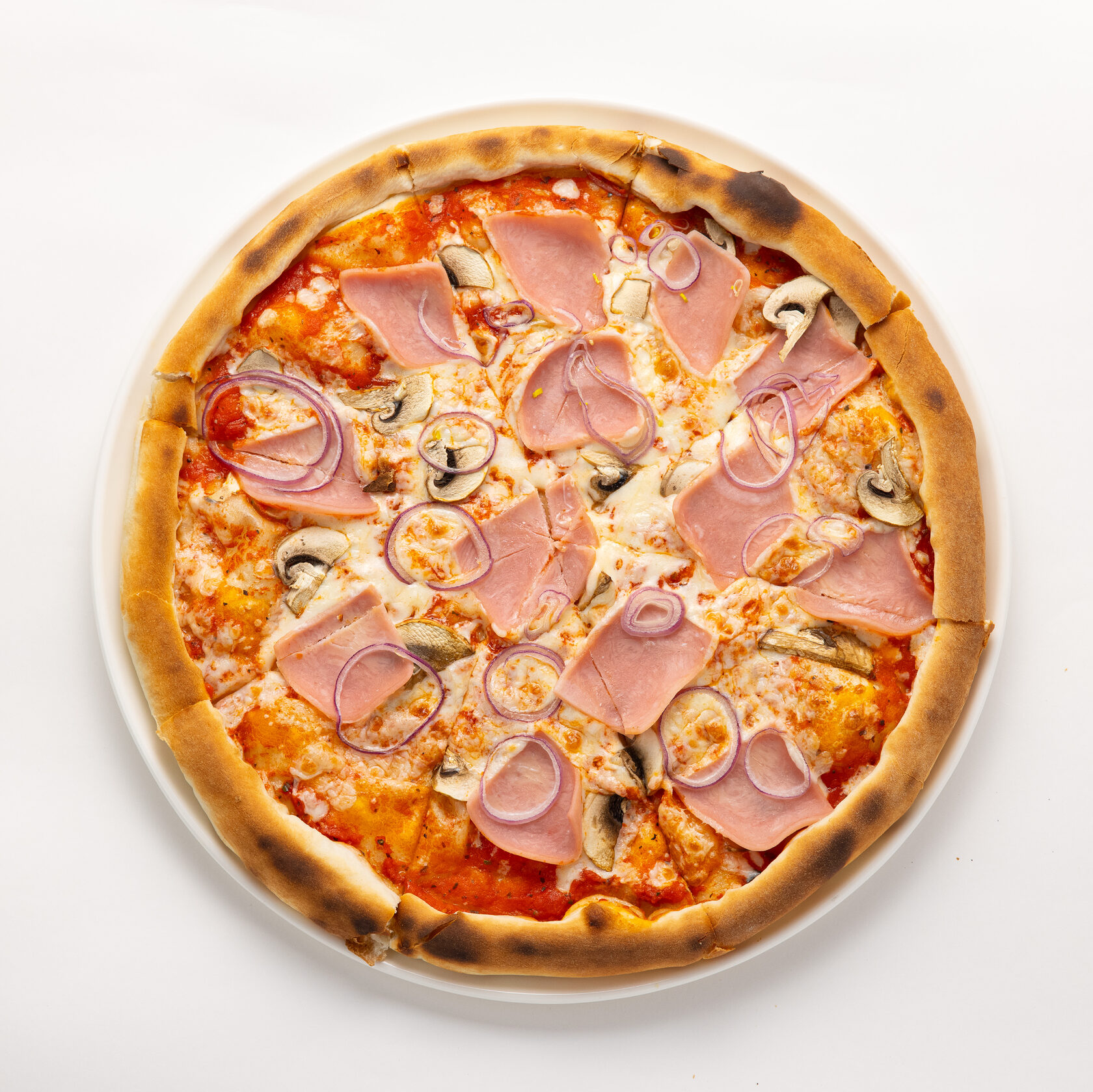 ветчина и грибы с красным луком и сыром на сливочном или томатном соусе