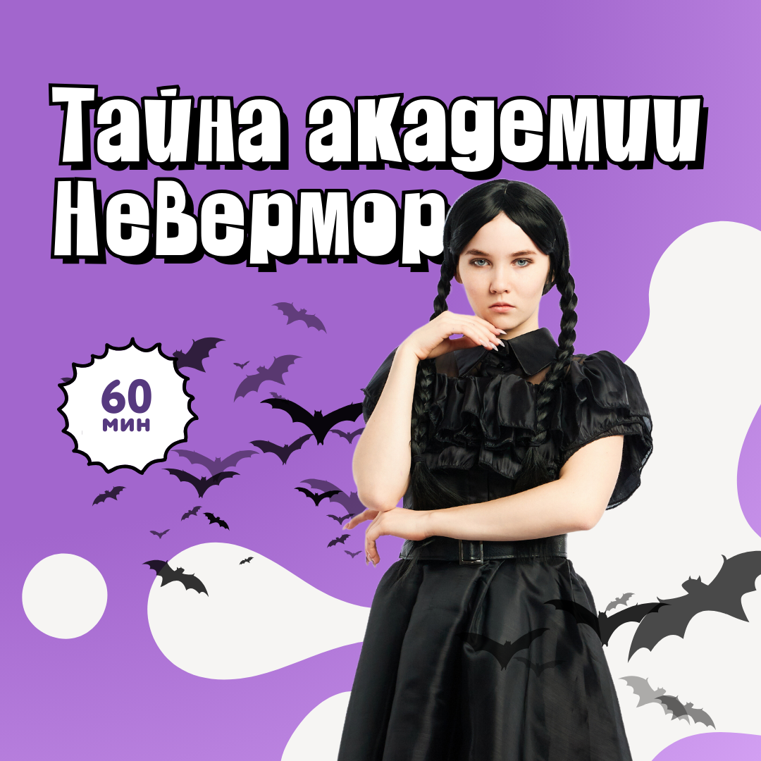 Вместе с самой необычной девочкой Уэнсдей дети познакомятся с тайнами школы Невермор. Магический сундук с Вещью, тематический реквизит по мотивам сериала, 6 самых необычных видений Уэнсдей, тематическое музыкальное сопровождение и авторская режиссура.